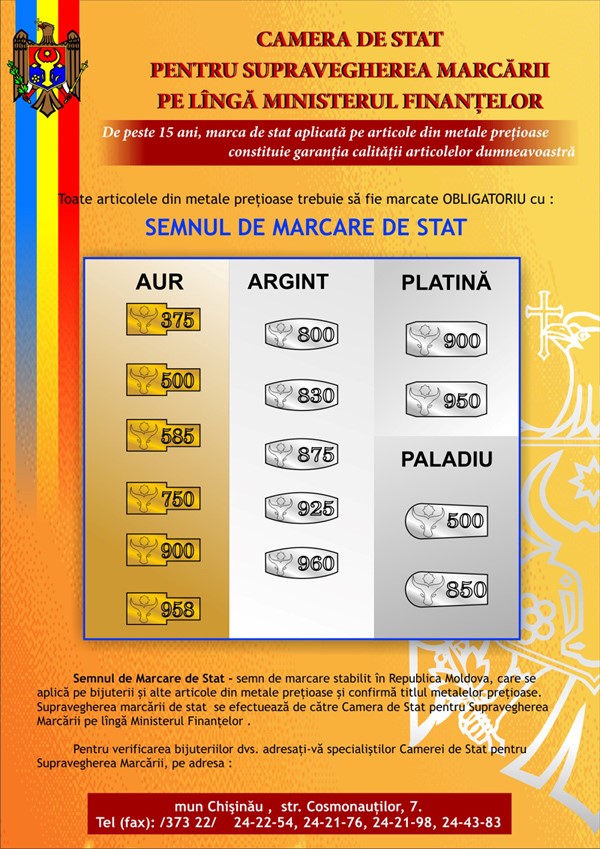 Răspuns: În conformitate cu prevederile pct. 11 al Hotărârii Guvernului nr.261 din 13.05.96, cu privire la aprobarea Regulilor comerţului cu amănuntul, recepţionării, păstrării şi evidenţei articolelor din metale preţioase şi pietre preţioase, comercializarea articolelor din metale preţioase şi pietre preţioase se efectuează în cazul în care au imprimatele ale emblemei producătorului şi imprimate ale marcajului de stat. Articolele de producţie străină, importate în Republica Moldova, trebuie, de asemenea, să aibă în mod obligatoriu imprimate ale marcajului de stat, aplicat de Camera de Stat pentru Supravegherea Marcării de pe lângă Ministerul Finanţelor al Republicii Moldova.